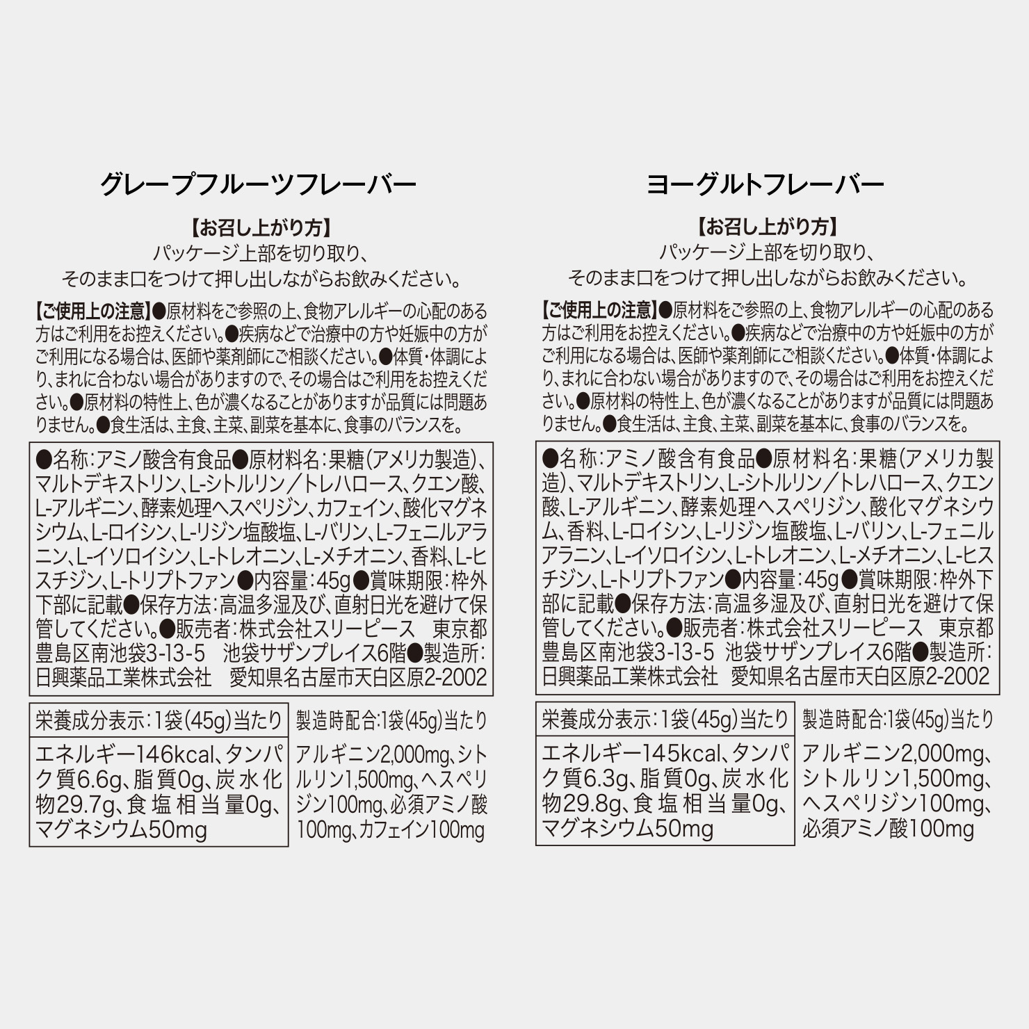果糖(アメリカ製造)、マルチデキストリン、L-シトルリン/トレハロース、クエン酸、L-アルギニン、酵素処理ヘスペリジン、カフェイン、酸化Mg、L-ロイシン、L-リジン塩酸塩、L-バリン、L-フェニルアラニン、L-イソロシン、L-トレオニン、L-メチオニン、香料、L-ヒスチジン、L-トリプトファン 【ヨーグルト風味】 果糖(アメリカ製造)、マルチデキストリン、L-シトルリン/トレハロース、クエン酸、L-アルギニン、酵素処理ヘスペリジン、酸化Mg、香料、L-ロイシン、L-リジン塩酸塩、L-バリン、L-フェニルアラニン、L-イソロシン、L-トレオニン、L-メチオニン、L-ヒスチジン、L-トリプトファン |