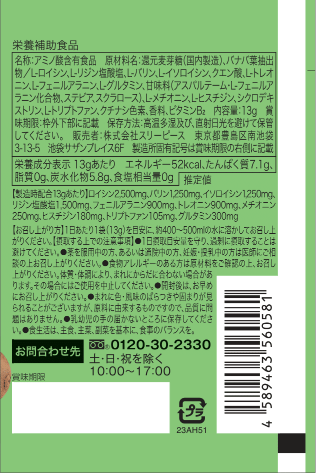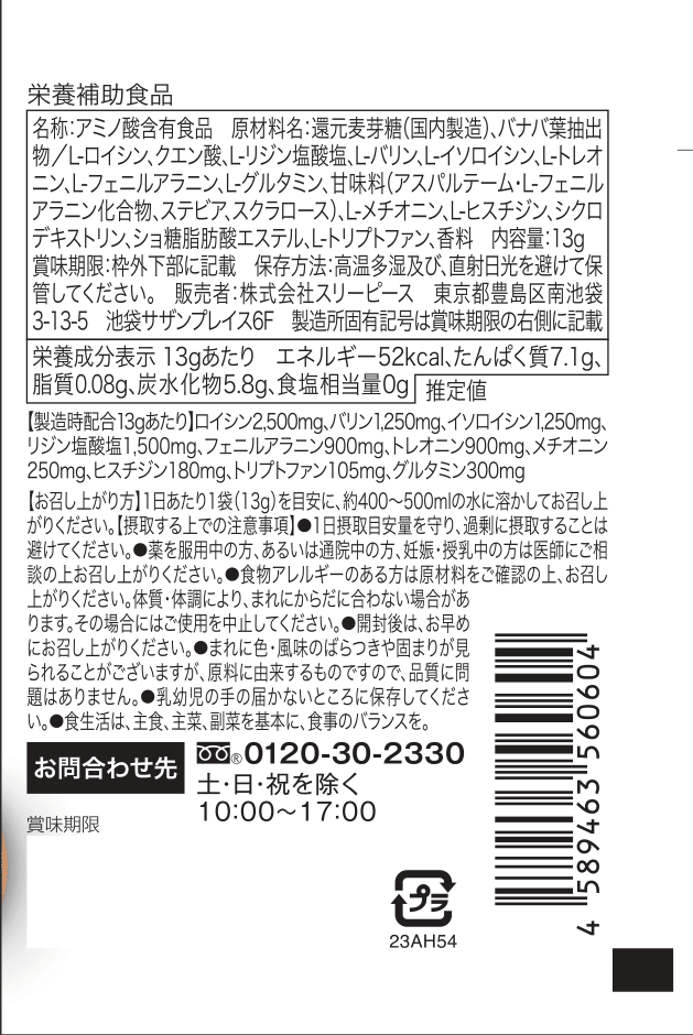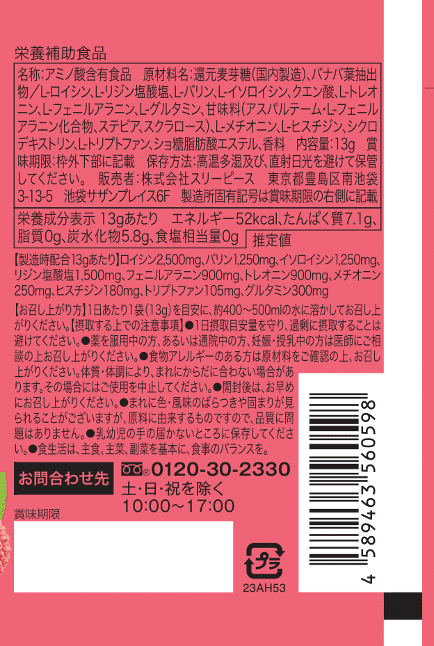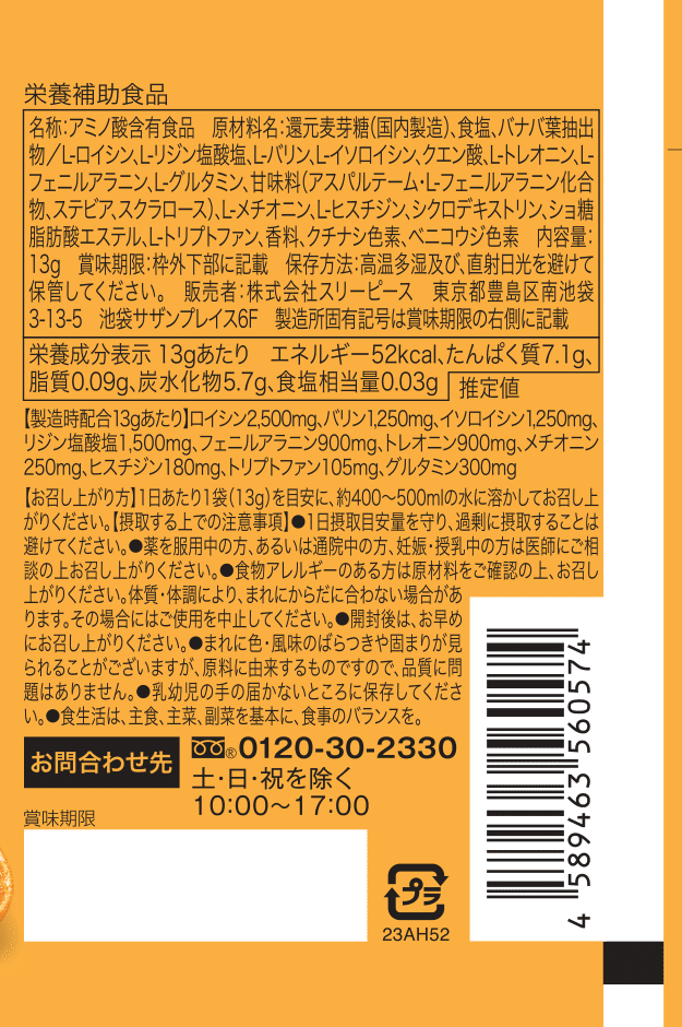 L—トリプトファン、クチナシ色素、香料、ビタミンB2 ライチ:還元麦芽糖(国内製造)、バナバ葉抽出物/L-ロイシン、 L—リジン塩酸塩、L—バリン、L—イソロイシン、クエン酸、 L—トレオニン、L—フェニルアラニン、L—グルタミン、甘味料 (アスパルテーム・ L—フェニルアラニン化合物、ステビア、 スクラロース) 、L-メチオニン、L—ヒスチジン、シクロデキストリン、 Lートリプトファン、ショ糖脂肪酸エステル、香料 温州みかん:還元麦芽糖(国内製造)、食塩、バナバ葉抽出物/L-ロイシン、L-リジン塩酸塩、L-バリン、L-イソロイシン、クエン酸、L-トレオニン、L-フェニルアラニン、L-グルタミン、甘味料(アスパルテーム・L-フェニルアラニン化合物、ステビア、スクラロース)、L-メチオニン、L-ヒスチジン、シクロデキストリン、ショ糖脂肪酸エステル、L-トリプトファン、香料、クチナシ色素、ベニコウジ色素 マンゴー:還元麦芽糖 (国内製造)、食塩、マンゴー果汁末、バナバ葉抽出物/L- ロイシン、L-リジン塩酸塩、L-バリン、L-イソロイシン、クエン酸、L-トレオニン、L-フェニルアラニン、L-グルタミン、甘味料(アスパルテーム・L-フェニルアラニン化合物、ステビア、スクラロース、ソーマチン)、L-メチオニン、ショ糖脂肪酸エステル、L-ヒスチジン、シクロデキストリン、L-トリプトファン、増粘剤(キサンタンガム)、香料、クチナシ色素、ベニコウジ色素 |
