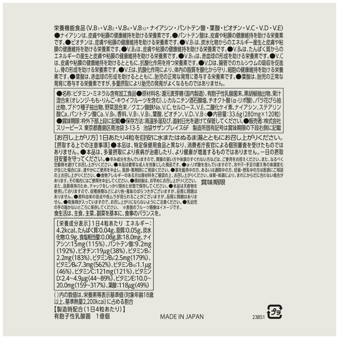 原材料名 | 還元麦芽糖(国内製造)、有胞子性乳酸菌末、黒胡椒抽出物、果汁混合末(オレンジ・もも・りんご・キウイフルーツを含む)、L-カルニチン酒石酸塩、チオクト酸(α-リポ酸)、バラ花びら抽出物、ブドウ種子抽出物、野菜混合末/クエン酸鉄Na、V.C、セルロース、V.E、二酸化ケイ素、ナイアシン、ステアリン酸Ca、パントテン酸Ca、V.B6、HPC、V.B1、V.B2、シェラック、葉酸、香料、ビオチン、甘味料(スクラロース)、V.D、V.B12 |