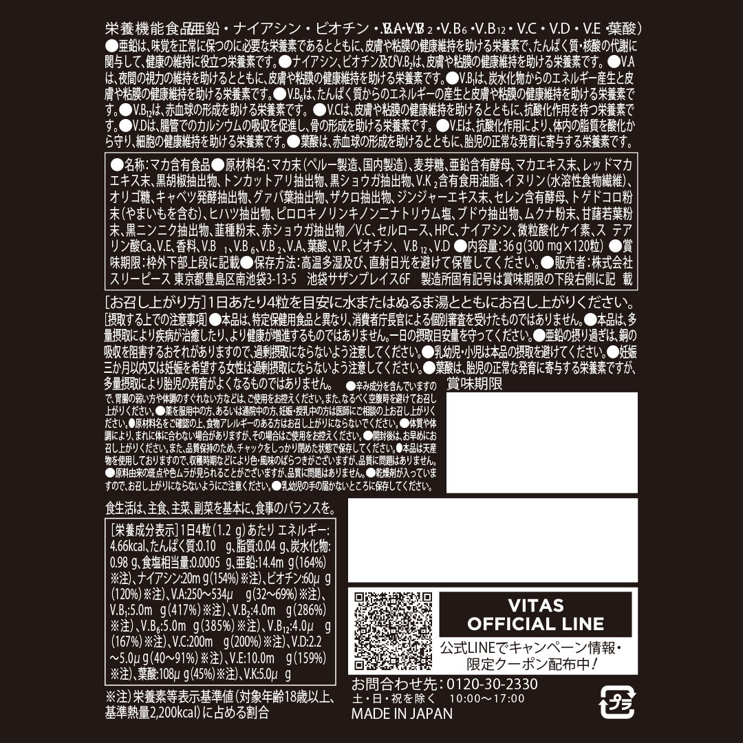 原材料名 | マカ末(ペルー製造、国内製造)、麦芽糖、亜鉛含有酵母、マカエキス末、レッドマカエキス末、黒胡椒抽出物、トンカットアリ抽出物、黒ショウガ抽出物、V.K2含有食用油脂、イヌリン(水溶性食物繊維)、エゾウコギエキス末、オリゴ糖、キャベツ発酵抽出物、グァバ葉抽出物、ザクロ抽出物、ジンジャーエキス末、セレン含有酵母、トゲドコロ粉末(やまいもを含む)、ヒハツ抽出物、ピロロキノリンキノン二ナトリウム塩、ブドウ抽出物、ムクナ粉末、甘藷若葉粉末、黒ニンニク抽出物、韮種粉末、赤ショウガ抽出物/V.C、セルロース、HPC、ナイアシン、微粒酸化ケイ素、ステアリン酸Ca、V.E、香料、V.B1、V.B6、V.B2、V.A、葉酸、V.P、ビオチン、V.B12、V.D |