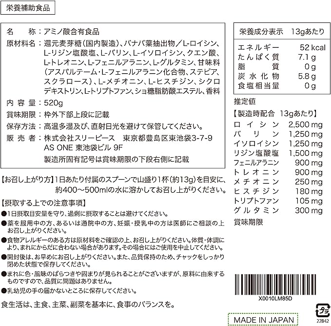| 原材料名 | 原材料名:還元麦芽糖(国内製造)、バナバ葉抽出物/L-ロイシン、 L—リジン塩酸塩、L—バリン、L—イソロイシン、クエン酸、 L—トレオニン、L—フェニルアラニン、L—グルタミン、甘味料 (アスパルテーム・ L—フェニルアラニン化合物、ステビア、 スクラロース) 、L-メチオニン、L—ヒスチジン、シクロデキストリン、 Lートリプトファン、ショ糖脂肪酸エステル、香料 |