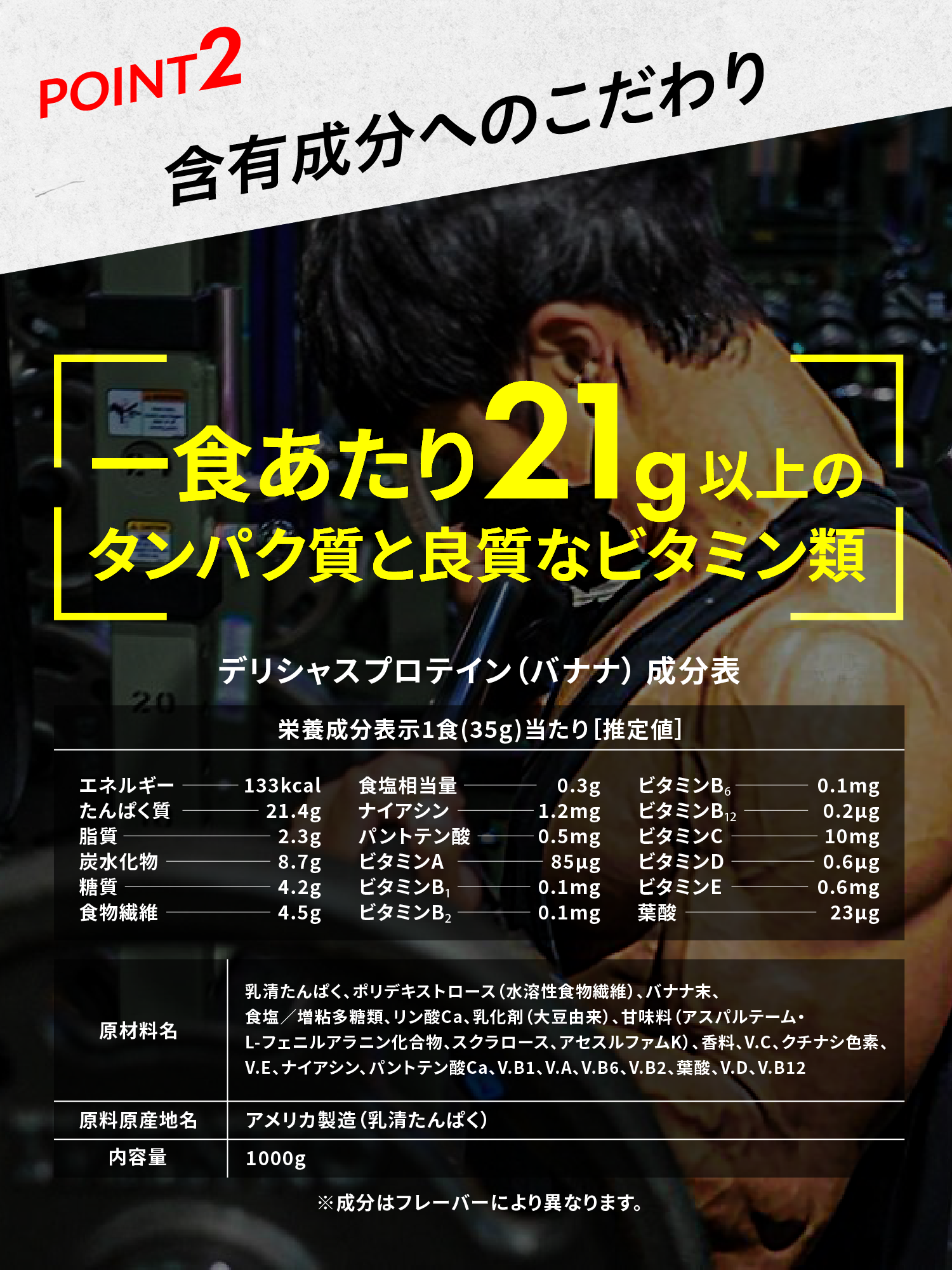 | 原材料名 | 乳清たんぱく、ポリデキストロース(水溶性食物繊維)、バナナ末、 食塩/増粘多糖類、リン酸Ca、乳化剤(大豆由来)、甘味料(アス パルテーム・L-フェニルアラニン化合物、スクラロース、アセスル ファムK)、香料、V.C、クチナシ色素、V.E、ナイアシン、パントテン 酸Ca、V.B₁、V.A、V.B₆、V.B₂、葉酸、V.D、V.B₁₂ |